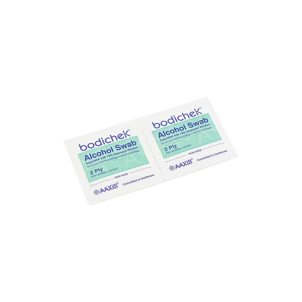 - A skin cleansing swab saturated with 70% isopropyl alcohol