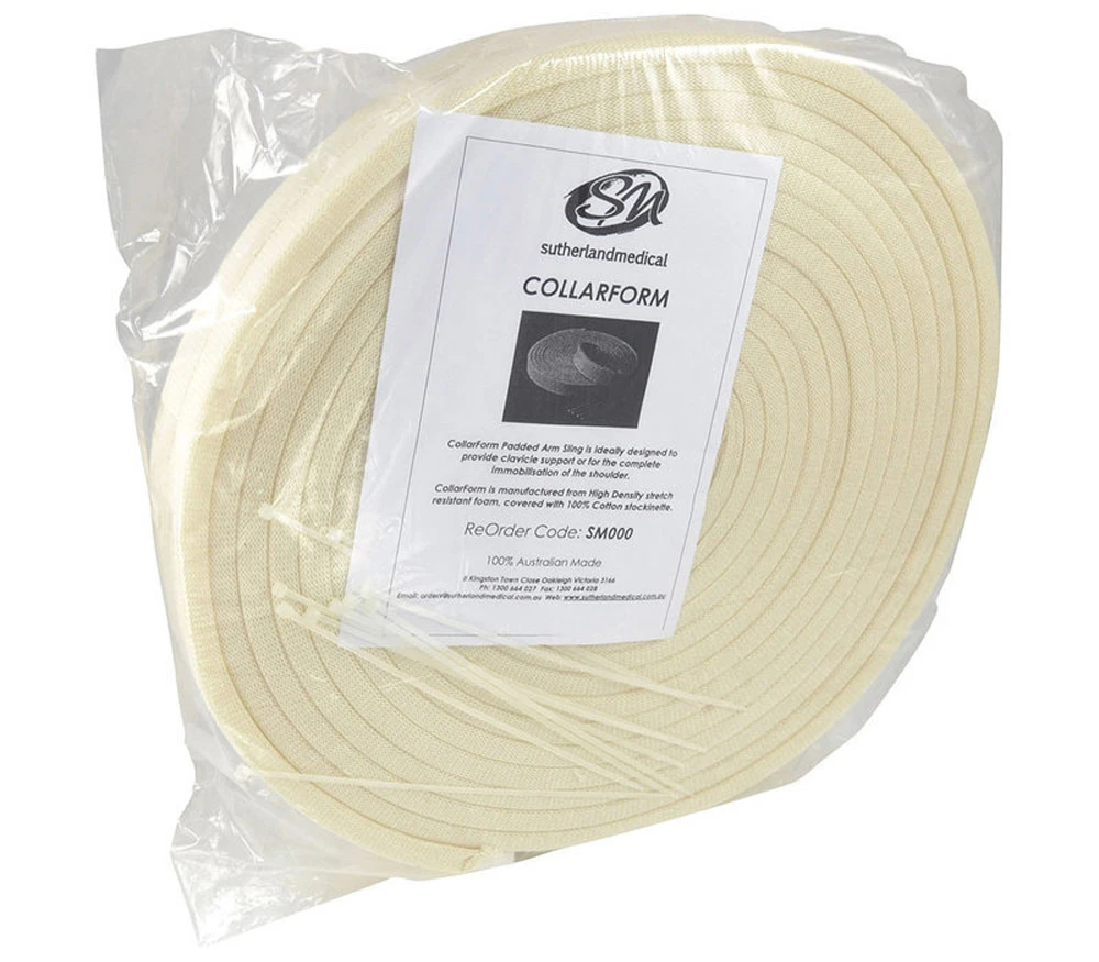 Collar and Cuff is a strong, stretch resistant sling made of a 5cm wide strip of dense foam covered with a pure cotton stockinette.
