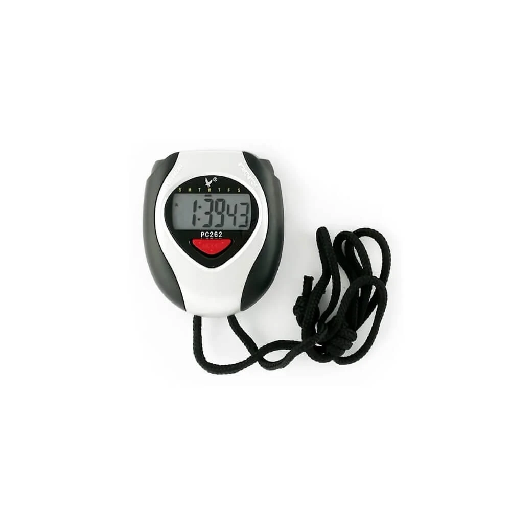 Digital Stopwatch with 6 Digits and 1/100 seconds for up to 30 minutes. Also has inbuilt time of day, calendar and alarm. Works on 1x AAA Battery.
